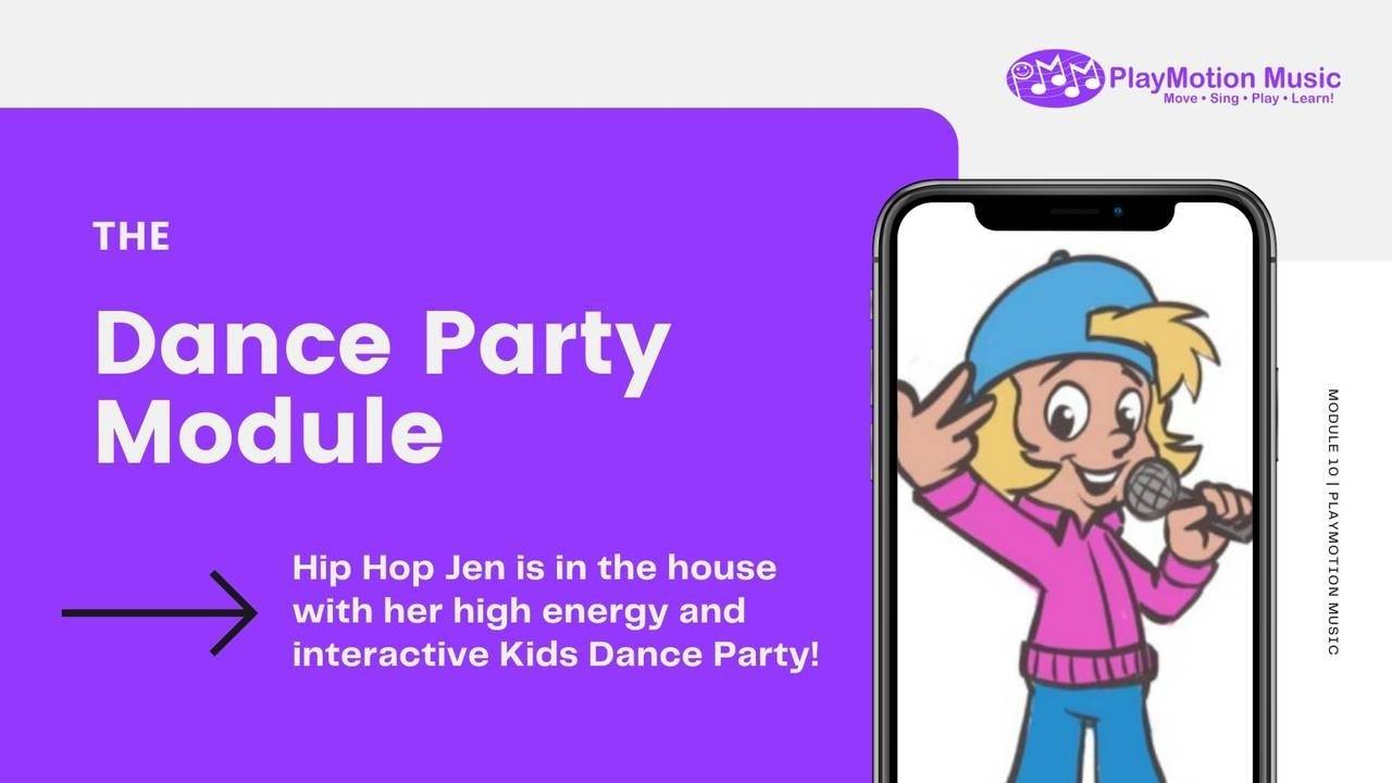 Hip Hop Jen is in the house with her high energy and interactive Kids Dance Party! In this module we use fun dance beats and catchy rhythms to get everyone up and DANCING!